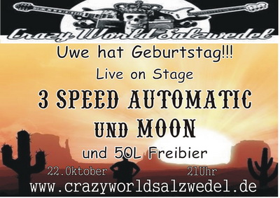 20 Jahre Crazy World Salzwedel - große Geburtstags Party mit 6 Bands und 100 Liter Freibier am 30.Juni spielen Enrico Morè, Shutgun Valium & Bordstein am 01.Juli spielen Shutgun Valium, Neume & Freygang Tickets für 20 Jahre Crazy World Party: Freitag 30.Juni - Vorverkauf 7€ - Abendkasse 8€ Samstag 01.Juli - Vorverkauf 11€ - Abendkasse 12€ Kombiticket - Vorverkauf 17€ - Abendkasse 20€ die Tickets können ab sofort im Crazy World bestellt und abgeholt werden!